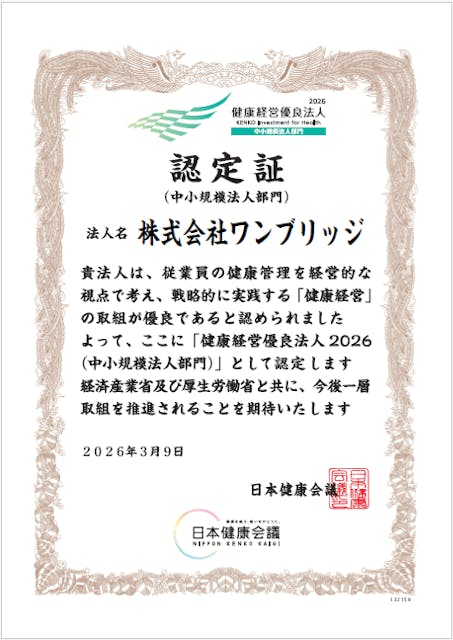 株式会社ワンブリッジは、2026年3月9日、経済産業省と日本健康会議が共同で実施する「健康経営優良法人認定制度」において、健康経営に関する各種取り組みが評価され、「健康経営優良法人2026(中小規模法人部門)」の更新認定を受けました。
